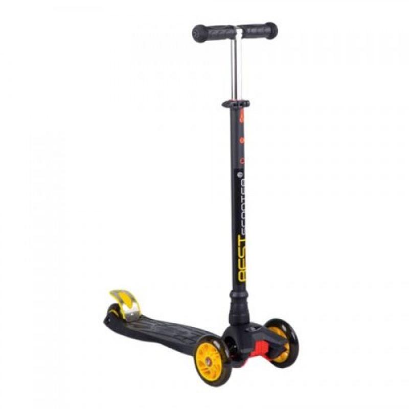 Самокат трехколесный "Best Scooter". Диаметр колес: передние - 12 см., задние сдвоенные - 8 см. (все со светом). Рама и руль – алюминий; дека – пластик; колеса – полиуретан. Ширина деки - 14 см. Высота руля - от 67 до 90 см. Максимальная нагрузка - 60 кг. Задний ножной тормоз.