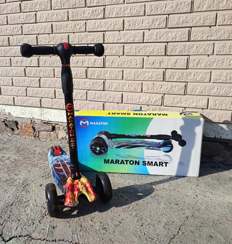 Дитячий 3-колісний самокат Maraton smart посилений. Самокат в чудовому стані, повністю справний, всі колеса світяться, трохи стерся малюнок на платформі, в іншому все добре. Оптимально підійде ( з власного досвіду) для дитини з 2 до 5 років, але можна раніше і довше користуватися. У використанні був 2 сезони. Міцний і надійний. Характеристики: Самокат: maxi посилений Рекомендований вік: з 2,5 років Висота ручки: мінімальна висота від платформи – 60 см, від підлоги – 67 см. Максимальна висота від платформи – 80 см, від підлоги – 87 см. Витримує навантаження: до 70 кг Кількість коліс: 4 шт Розмір коліс: передні колеса: діаметр 14 см, ширина 4 см; задні колеса: діаметр 9 см, ширина 2.5 см Матеріал коліс: поліуретан, м'які, не шумлять Колеса: світяться Підшипники: ABEC 9 Гальмо: ножне, натиском на задні колеса Розмір платформи: довжина 36 см; ширина 13 см Довжина всього самокату: 65 см Ширина ручок: 31 см Ручка: складана Поворот здійснюється нахилом тіла (керма) вправо-ліворуч. Вага самокату: 4.1 кг у коробці