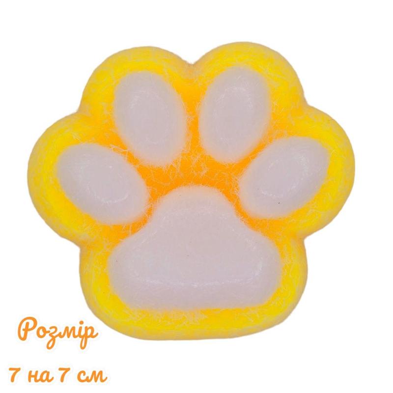 Детская игрушка антистресс сквиш желтого цвета в виде лапки котика с шерстью (размер 7 см...