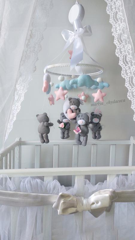 Декоративний мобільний ручної роботи з фетру. Мобіль пошитий вручну з фетру найвищої якості, а всередині кожної фігурки м'який гіпоалергенний наповнювач. Також у мобіль входять намистини з вовни австралійського мериноса, повалені вручну. Мобіль може бути виконаний у будь-якому кольоровому поєднанні. Палітра налічує понад 50 варіантів кольорів. Напишіть які кольори Вас цікавлять, прикріпіть фотографії Вашої дитячої або картинки, що просто сподобалися Вам, а я підберу для Вас варіанти квітів і разом ми створимо мобіль Вашої мрії
