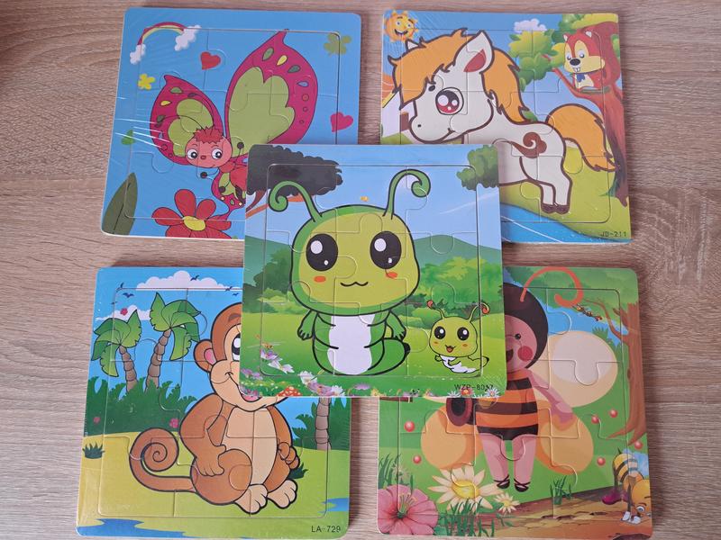 Дерев'яні пазли– відмінний подарунок для маленької дитини. Набір з п'яти штук .Кожен пазл складається з 9 елементів, що робить гру з ним можливою навіть для маленьких діток. Екологічно чисті матеріали, з яких зроблена іграшка, є абсолютно безпечними для здоров'я малюків. Завдяки дерев'яним пазлам малюк поліпшить дрібну моторику, розвине логіку і зрозуміє важливість частини і цілого. розмір 15×15см 9 елементів