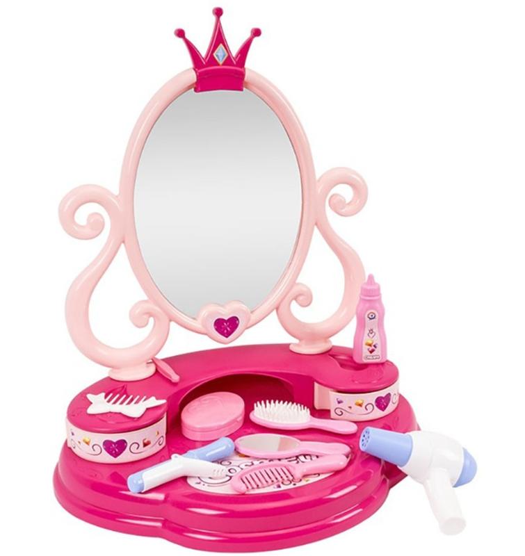 Этот стильный столик имеет большое наполнение, которое позволяет Вашему ребенку играть в стилиста или парикмахера, делать прически и макияж. В комплекте столика кроме трюмо есть расческа, щетка, зеркальце, пинцет, заколка-гребешок, плойка, пудреница, фен, тюбик крема - всего 9 аксессуаров. Преимуществом столика является большое зеркало, размером: ширина 21,5 см и высота 31 см, которое благодаря качественному безопасному покрытию отображает реалистичное изображение вашей малышки. Еще одним "плюсиком" игрушки есть два небольших выдвижных ящика, в которых можно разместить все необходимое, а благодаря размерам есть возможность переносить столик в другое удобное место после окончания игры. Столик выполнен из качественной пластмассы без запаха. Косметический столик от ТехноК - идеальный подарок для маленькой девочки, мечтающей о собственном стильном косметическом столике. Он обеспечивает не только годы веселья и игр, но и развивает творческие способности Вашего ребенка, помогая ему развивать воображение, создавать собственный салон красоты и свой имидж.