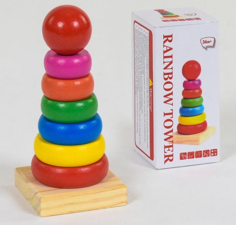 Класична пірамідка, завжди користувалась популярністю серед батьків при виборі розвивальної іграшки для дітей. Сенс гри полягає в тому, щоб дитина змогла розвинути основні навички: дрібну моторику рук та логічне мислення. Особливості: - іграшка виконана з якісного, нетоксичного дерева; - основа іграшки дерев'яна підставка з паличкою; - 7 деталей для нанизування - - верхівка пірамідки дерев'яна кулька. розмір 15×8×8см