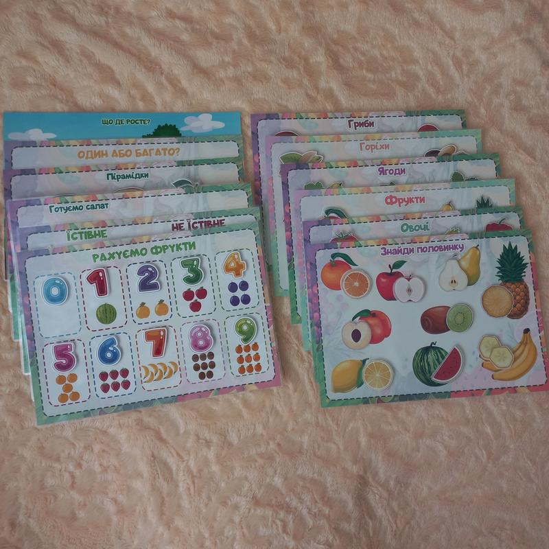 РОЗПРОДАЖ!!!! По ціні собівартості!!!! Залишилося лише 2 набори!!! Ігри на липучках Формат А4 Комплект з 12 ігор: ягоди, фрукти, овочі, горіхи, гриби, знайди половинку, готуємо суп і салат, один/багато, їстівне/не їстівне, пірамідки, рахуємо фрукти, що де росте