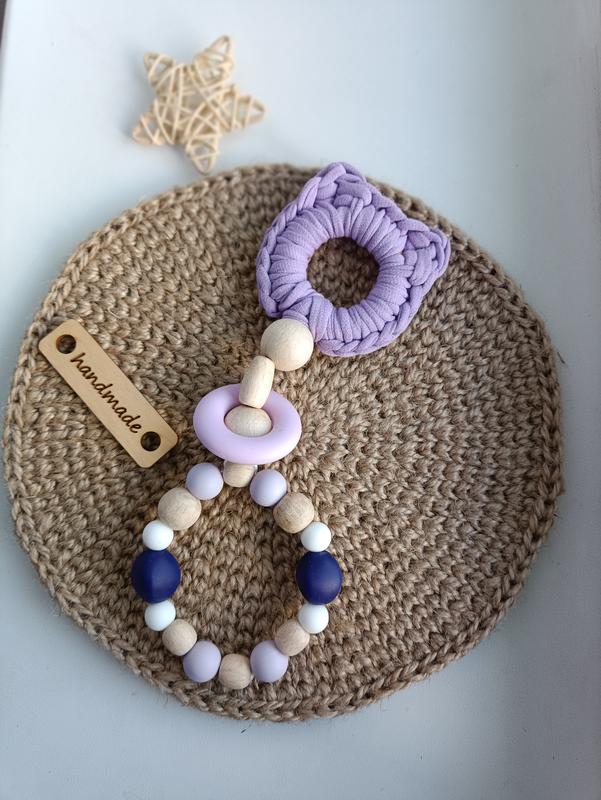Гризунець виготовлений з дерева, харчового силікону та пряжі для вашого малюка. Ручна робота 🙏 За рахунок різних текстур допомагає розробляти дрібну моторику пальців рук, тактильну та сенсорну пам'ять 💜