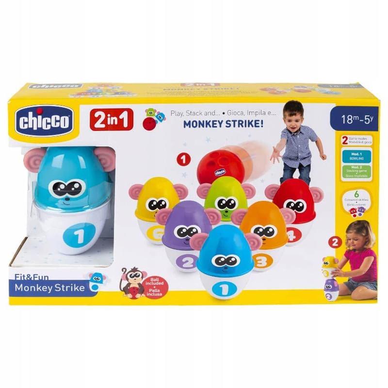 Игрушка Chicco Страйк обезьяны Первый набор для игры в боулинг поможет малышу весело провести время - необходимо забить страйк, сбив 6 ярких кеглей, которые украшены мордочками обезьян. Особенности: - Каждую кеглю можно разделить на две части, затем сложить красочную башню из 12 ярких частей, это поможет развивать творческие способности. - Каждая кегля имеет свой цвет и номер - с помощью этого малыш может учиться считать до 6. - В комплекте мягкий мячик, которым можно не только сбивать цели, но и играть отдельно. Игрушка способствует развитию творческих способностей и координации движений.