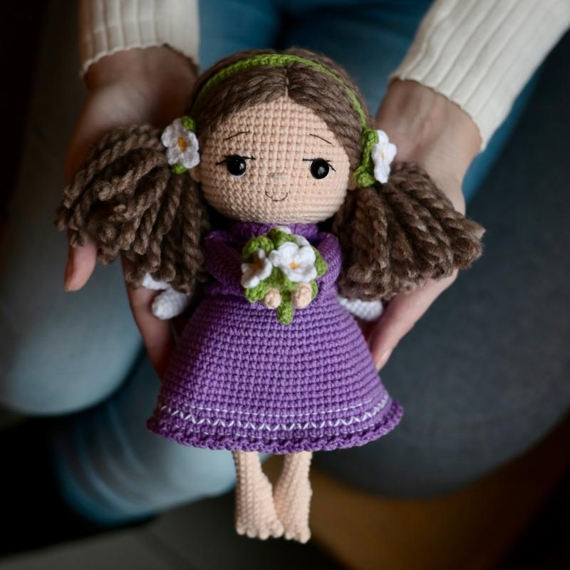 В'язана іграшка ручної роботи Під замовлення , терміни обговорюємо індивідуально . Дівчинка янгол Розмір +/-23 см Колір сукні можна обрати . Разом з іграшкою в комплекті іде букет , який знімається . Ззаду іграшка має крила , вони не знімаються . За вашим бажанням іграшка може бути без крил .