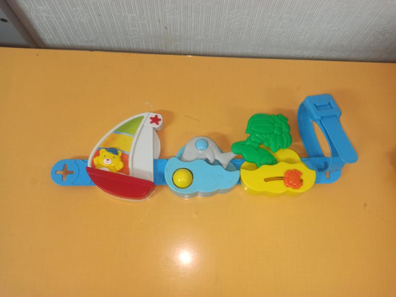 Игрушка на коляску Chicco. Мишутка на корабле можно перемещать.Шарики на дельфине крутится.Краб на пальме также передвигается. Трещотка, нет второго крепления,