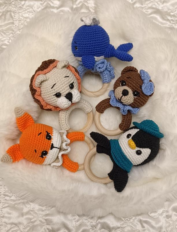 Брязкальце ручної роботи, в'язані гачком. Іграшки ручної роботи для найменших. Подарують вашому янголятві посмішку і радість. Виконані з турецької та італійської пряжі, вічка на безпечному кріпленні, усередині гремелка, кільце дерев'яне. Левко, Лисичка, Пінгвінчик, Ведмедик, Китёнок. Розмір 13 см. Зроблено з любов'ю.
