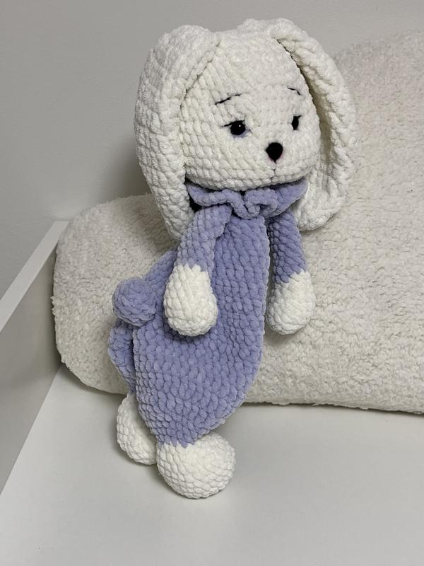 Іграшка-комфортер зайчик - це таємний помічник мами та милий друг для малюка в перші роки життя. Комфортер ручної роботи з плюшевої пряжі. Зайчик 40см (+-2см) - 650 грн.