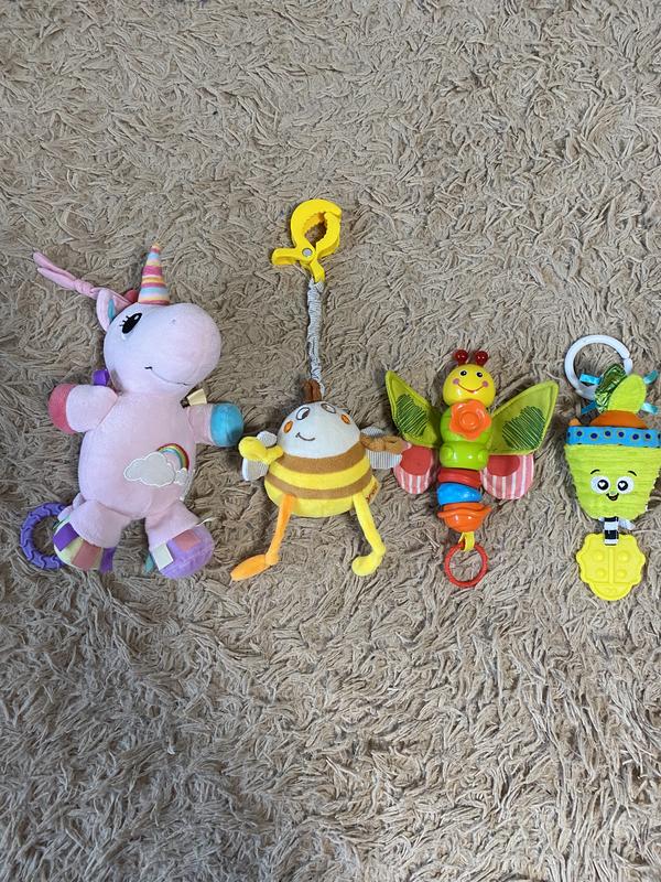 Підвіски на коляску чи у ліжечко в чудовому стані, є елементи, які шуршать, остання підвіска з прорізувачем на з неі витягується морквинка, вона нова, без бірки На єдиноріжці теж є прорізувач, в метелику потрібно замінити батарейку Ціни по 100 грн, морквинка 150 Якщо все разом, то 400