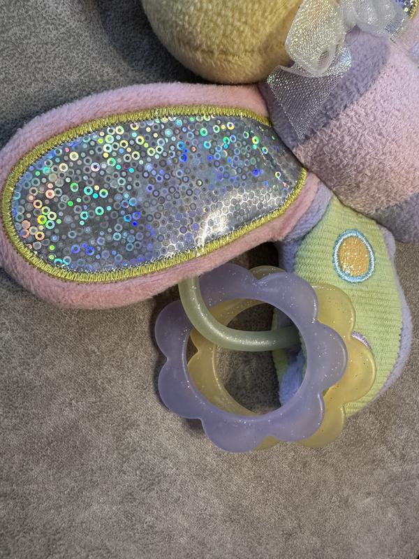 М'яка іграшка-підвіска Метелик з прорізувачем здатна розважати дітей годинами. У іграшки в голові кулька, яка торохтить, мерехтять крила, різні фактури тканини і кільця. Метелик кріпиться до коляски, до ліжечка. Розмір 22*16 см Можна прати