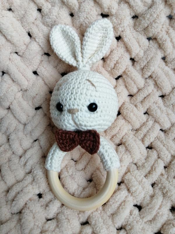 М'яке брязкальце гризунець з бавовняної пряжи на дерев' яному кілечку Мила безпечна іграшка для малечі