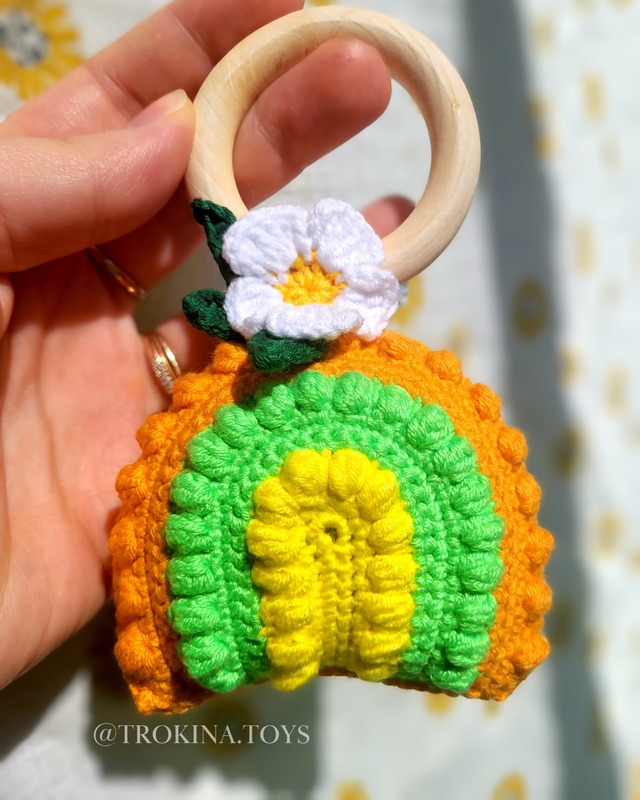 Яскрава іграшка-шуршалка для найменших дослідників💛💚🧡 __________ Особливістю цієї іграшки є фактурна шишката поверхня, яку не хочеться випускати з рук🫰🏻 Спеціальни шишечки розвивають дитячу моторику, а яскраві кольори поліпшують адаптацію оченят до барв🌈 В середині спеціальна плівка, що приємно шуршить, якщо натиснути на іграшку😍 Дерев'яне кленове кільце шліфоване, так що можна пробувати молочному зубчику☺️ __________ 🫶бавовняна пряжа; 🫶холохайбер; 🫶дерев'яне кленове кільце; 🫶плівка-шуршалка для звукового ефекту; 🫶100% милоти.... __________ 🏷 370 грн