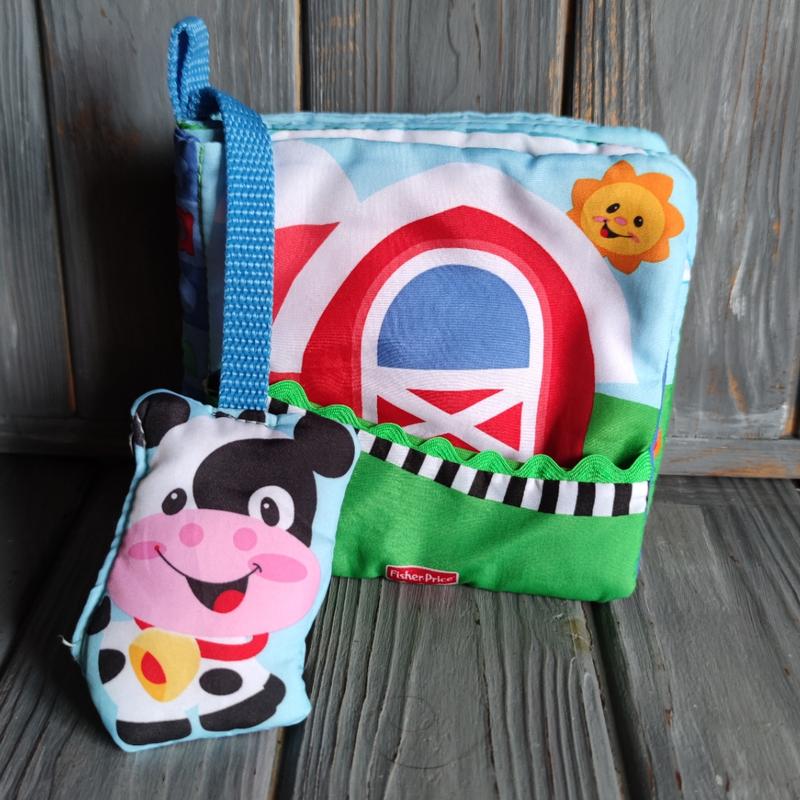 М'яка підвіска-книжка Fisher-Price День на фермі Книжечка знайомить малюка з тваринами, а її м'яка поверхня розвиває тактильні навички. Яскрава іграшка-корівка, прив'язана до книжечки, може подорожувати від сторінки до сторінки під час того, як мама читає дитині.