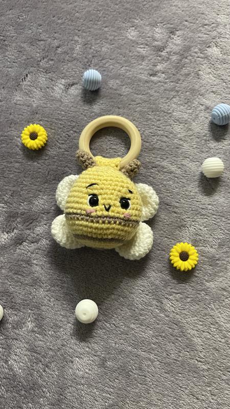 🐝 Брязкальце “Бджілка” ручної роботи 🐝 Ніжна й мила бджілка, створена в техніці амігурумі, стане першою улюбленою іграшкою вашого малюка! Вона не лише яскрава й приємна на дотик, але й має безпечне дерев’яне кільце для зручного тримання, а також легке брязкальце всередині — для стимуляції слуху. ✨ Матеріали: – 100% бавовна – Гіпоалергенний наповнювач – Безпечні пластикові оченята – Дерев’яне кільце, покрите натуральним воском 👶 Підходить з перших днів життя. 🎁 Ідеальний подарунок на народження, хрестини чи baby shower. 📏 Розмір: приблизно 13 см 🧼 Легкий догляд: делікатне ручне прання