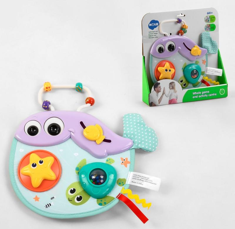 Оригінальне брязкальце E 268 від виробника "Hola" приховує в собі безліч сюрпризів, які надовго зацікавлять крихітку і неодмінно забезпечать правильний розвиток з перших місяців життя. Модель виготовлена з суміщених матеріалів: високоякісного текстилю із зображенням яскравих малюнків і легкого первинного пластику. Виконане брязкальце у формі кумедного кита. Тіло рибки обладнано безліччю ігрових елементів: - обертається морська зірочка з тріскачкою; - крутиться прозорий м'ячик з різно кольоровими кульками; - тренажер для розвитку зап'ястя у вигляді яскравої рибкою з тріскачкою; - обертові очі різного діаметру; - фігурна ручка для перенесення зі строкатими намистинами; - хвостик з шелестким елементом; - 2 стрічки виконані з різних матеріалів. Брязкальце-кит у поєднанні з яскравим оформленням, тканинами з різними фактурами та цікавим ігровим функціоналом посприяє тактильному і візуальному сприйняттю, розвине дрібну моторику ручок, а також стане найулюбленішою іграшкою для дитини!
