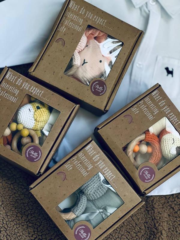 Комплектація у кожного набору різна (видно на фото). Мусліновий плед, іграшки, гребінець, слинявчик, декоративна деревʼяна картинка для фото тощо. Чудовий подарунок на виписку з пологового будинку, хрестини