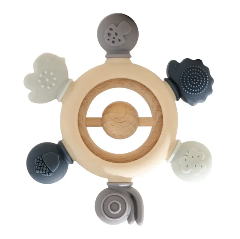 Прорезыватель необходим, чтобы облегчить ребенку период появления первых зубов. Форму в виде кольца удобно держать в руках, а фактура натурального бука приятна на ощупь. Безопасную деревянную рукоятку тоже можно грызть, но силиконовые лепестки понравятся малышу больше – они отличаются рельефом, чтобы ребенок мог выбрать любимую поверхность, а также узнавал тактильное разнообразие мира. Особенности Удобная форма в виде кольца Основание из натурального дерева можно грызть Различная текстура на лепестках Мягко массирует десну Облегчает зуд в период прорезывания и роста зубов Уход и хранение Мыть теплой водой с мылом, тщательно ополаскивать. Сушить при комнатной температуре. Не используйте для мытья сильнодействующие чистящие средства, содержащие абразивные частицы. Не кладите в морозильную камеру. Не подвергайте прорезывателю воздействие высоких температур. Не кипятите прорезыватель. Не мойте прорезыватель в посудомоечной машине. Мойте после каждого использования. Хранить в недоступном для детей месте. • Хранить в сухом проветриваемом помещении.