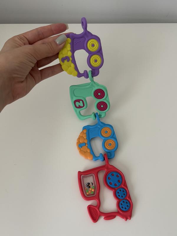 Іграшка-брязкальце «Паравозик 1 2 3». Вагони можна зʼєднувати та розʼєднувати, кожен вагон пронумерований. Має вушко для кріплення. Іграшка була у вжитку, проте стан ідеальний.