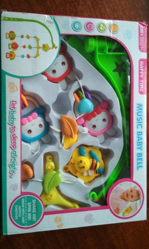 прикріплюють до кроватки, грає мелодія,крутиться, заводиться вручну, все працює, в упаковці
