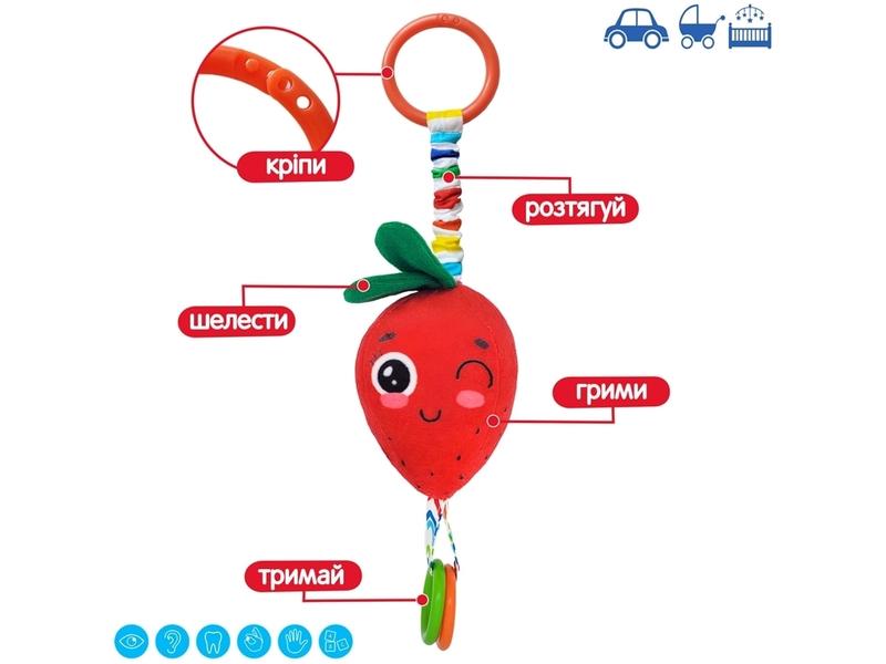 Брязкальце-підвіска з прорізувачем "Полуниця" МС 110604-18 Розмір полуниці зручний для дитячих рук, зелені листочки шарудять, адже мають спеціальні вставки, внизу іграшки є 2 пластикові кільця. Також підвіска містить "гримільник", що привертає особливу увагу малюка під час гри. Нова