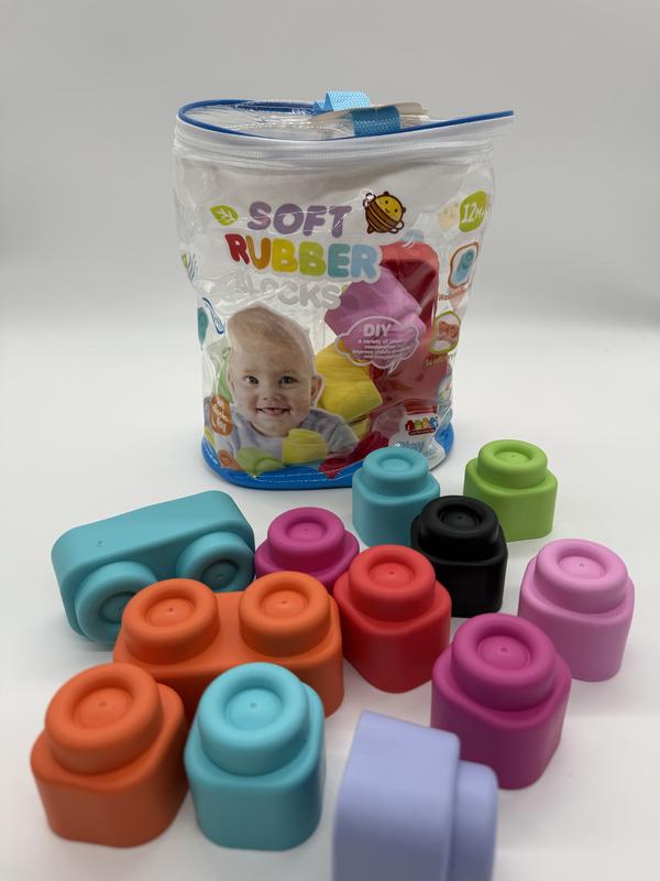 М’які кубики-конструктор Soft Rubber Blocks у чохлі Рекомендовано від 12 місяців. 23 деталі Безпечний, яскравий та цікавий набір м’яких кубиків – ідеальний перший конструктор для малюків! Виготовлені з приємного на дотик, нетоксичного м’якого силікону, ці блоки легко стискаються, не мають гострих кутів і чудово підходять для маленьких ручок. •Вік: від 12 місяців •Упаковка: прозорий чохол на блискавці з ручкою для зручного зберігання •Розвиває: моторику, логіку, координацію, уяву •Легко миються, можна використовувати під час купання