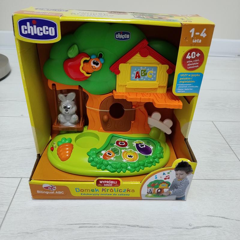 Разговорный учебный набор для обучения детей более 40 слов, песенкам и звукам. Игра Chicco двуязычная: польский и английский. 3 игровые зоны (качалка, сад и домик на дереве) + механический ползунок. Появляется зайчик и говорит, что куда идет, названия цветов и овощей, а также песенки с азбукой. Игровой набор стимулирует воображение ребенка к созданию историй с персонажем зайчика. Состояние новое