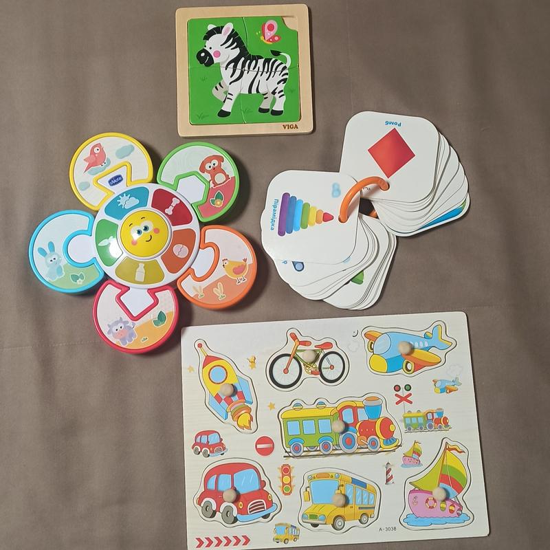 В наборі дерев'яний вкладиш пазл, дерев'яна дошка з вкладишами транспортом, музична іграшка гра від Chicco, книжка з картинками і назвами. З нюансів на дошці з вкладишами зверху трохи обірвана картинка. Ціна за все. Дивиться інші мої оголошення, є багато іграшок.