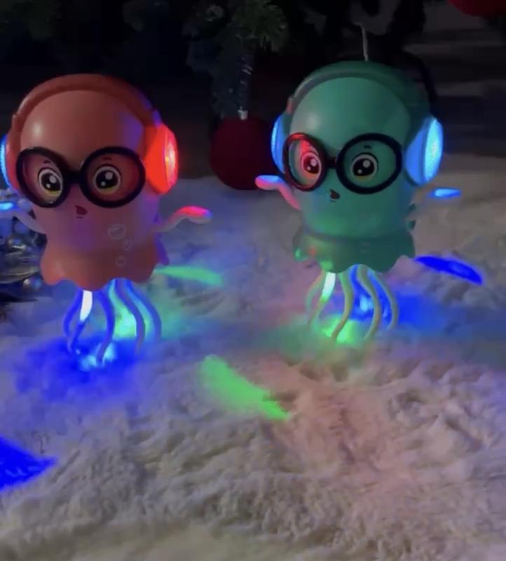 Танцюючий восьминіг. Також є підсвітка. Є відеоогляд на іграшку. Кольори рожевий та зелений.