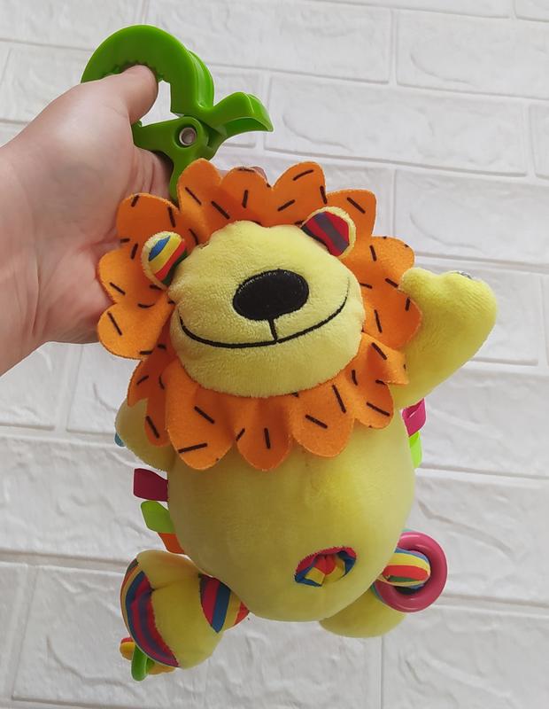На зображенні показана активна іграшка-підвіска у вигляді левеняти від Biba Toys. Іграшка призначена для підвішування до ліжечка або коляски за допомогою зеленого пластикового кільця. Вона виготовлена з тканин різної фактури для розвитку тактильних відчуттів. Містить брязкальце всередині та прорізувачі на ніжках для стимуляції слухового та зорового сприйняття. Рекомендований вік для використання — від 3 місяців.