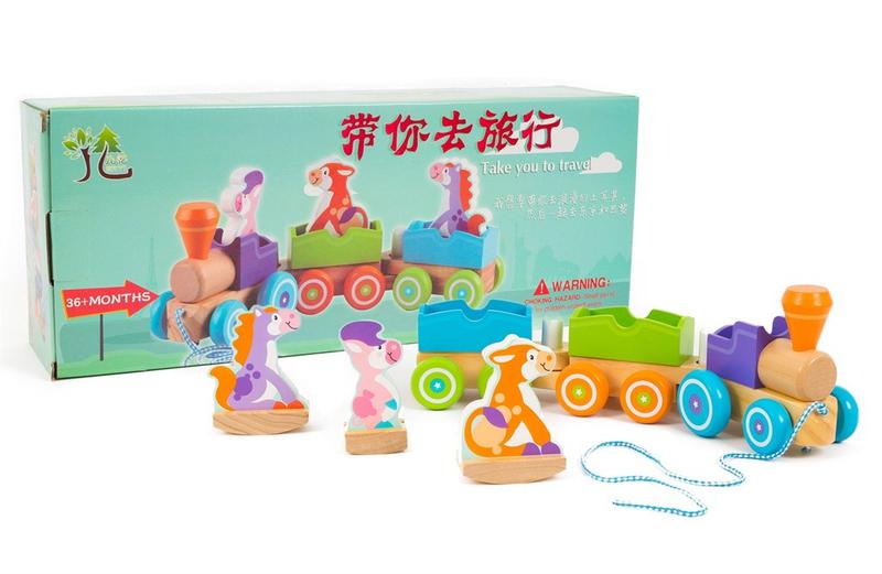 Интересный детский поезд из экологически чистого дерева. Игрушка состоит из трёх составных вагончиков разного цвета, а также трёх фигурок животных: коровки, лошадки, и поросёнка-машиниста. Укомплектуйте в своём порядке животных по вагонам, хватайтесь за шнурочек, и -- поехали!