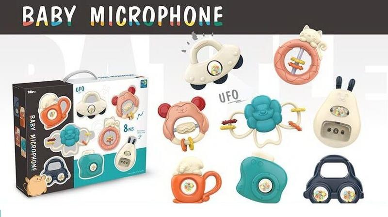 Кожен малюк із подивом відкриває для себе навколишній світ, стикаючись щодня з новими, незвичайними предметами, що викликають у нього інтерес. Тому так важливо оточити його не лише веселими, а ще й корисними грушками, які будуть задіяти різні органи чуття. Чудовий набір брязкальця 606 "Baby Microphone" поєднує в собі розвиваючий функціонал, оригінальний дизайн з приємними пастельними відтінками та високу якість самих іграшок. У комплектацію входить 8 брязкальців з м'якими гумовими гризунками, рухливими елементами, які видають приємні звуки, що гримлять. Іграшки легко поміщаються в маленьку дитячу долоньку і можуть використовуватися як прорізувачі. Комплектація: 1. Машинка з ручкою і двома прозорими м'ячами, що крутяться, які наповнені дрібними різнокольоровими кульками. 2. Фотоапарат з великою кнопкою, яка обертає прозорий м'ячик із гримаючими елементами. 3. Зайчик з м'якими гумовими вушками, прозорою кнопкою і дрібними різнокольоровими кульками. 4. Кільце з котиком і двома намистинами з фактурною поверхнею. 5. Квіточка-гризунок з фактурними кільцями. 6. Кільце-мавпа з м'якими гумовими вушками з роликом, що обертається, з фігурною основою і двома кільцями. 7. Брязкальце-гризунок з ручкою, у формі літаючої тарілки і прозорою кулькою, що обертається, з гримаючими елементами. 8. Брязкальце у формі чашечки з гномиком, з кулькою, що обертається. * Характеристики та комплектація товару можуть змінюватися виробником без попередження.