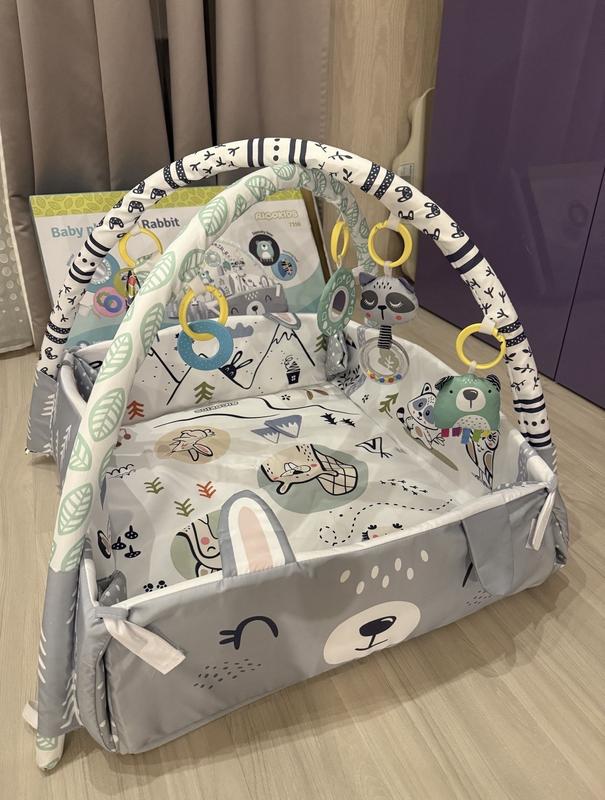 Дитячий ігровий килимок 3в1 - це прекрасна ігрова зона для малюків від самого народження. Він зроблений з м'якого і приємного на дотик матеріалу, що забезпечує комфорт і безпеку для дитини. Основною особливістю цього килимка є можливість підняти бортики, організовуючи безпечний простір, на кшталт манежу, для маленьких непосид. Коли дитина торкається іграшок, вони видають приємні звуки, це допомагає розвивати координацію рухів та стимулювати розвиток слухо-зорового сприйняття. Його компактні розміри та незначна вага дозволяють розкласти килимок на підлозі кімнаті або брати з собою під час прогулянок або мандрівок. Він легко складається і збирається, що робить його зручним для перенесення і зберігання. Особливості: - габаритні розміри: 110х105 см; - бортики підіймаються, перетворюючи килимок на манеж; - м’які безпечні дуги з кріпленнями для брязкалець; - ніжна колірна гама; - зручний кошик для зберігання ігрових елементів; - виготовлений з м'якого і приємного на дотик матеріалу, що забезпечує комфорт і безпеку для дитини. Комлектація - Килимок - 5 підвісних іграшок -Подушка -20 мʼячиків -подарункова упаковка