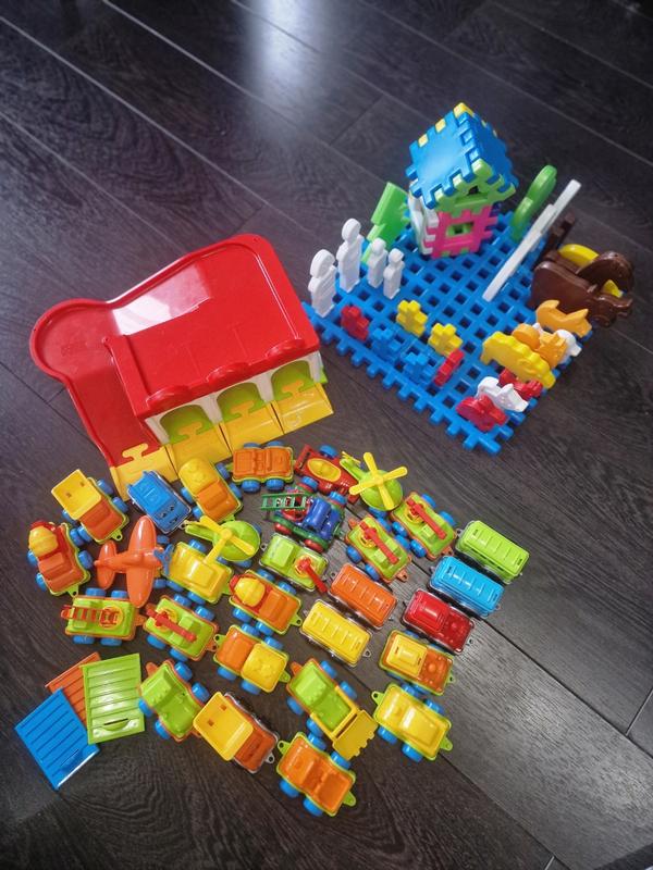 Іграшки машинки різноманітні, гелікоптер, літак, потяг і гараж В гаражі зламані кріплення на дверцятах, погано тримаються Чудовий конструктор м'який( сім'я, тваринки, будиночок...