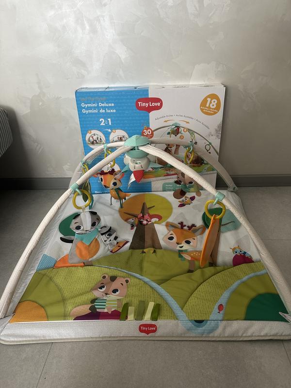 Розмір килимка: 86 х 44 х 76 см; Вік 0+ - виконаний з якісних та безпечних матеріалів; - нижня частина килимка водонепроникна; - дві дуги, які можна відрегулювати по висоті та нахилу або зняти; - іграшкова пташка зі світловими та звуковими ефектами (30 мелодій та звуків), є режим де дитина торкається пташки і вона змінює мелодію; - безпечне дитяче дзеркало; - шорсткий єнот; - милий оленя, що вібрує; - брязкальце у вигляді борсука; - прорізувач для зубів( є дефект на фото ) на функцію не впливає - всі іграшки можна знімати Перед виставленням на продаж, випрали килимок дитячим порошком. Стан іграшок чудовий. Є коробка , інструкція та чек покупки
