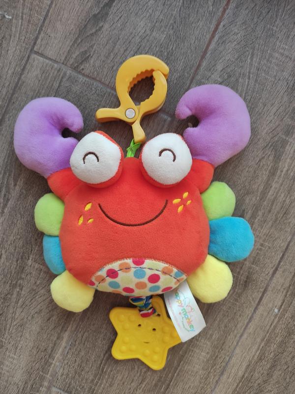 На дзеркалі пльонка,трохи поцарапана. М'яка розвиваюча підвіска на коляску або автокрісло. Велика кількість різних за фактурою та кольором елементів допоможе розвивати тактильні відчуття дитини і зір. Знизу до іграшці пришитий м'який гризунок. Лапки приємно шарудять. На спині знаходиться безпечне дзеркальце. Підвішується за колечко - кліпсу. Виготовлена з якісних та безпечних для здоров'я дитини матеріалів. Особливості: Яскраві кольори привертають увагу дитини. Розвиває органи зору і слуху, дрібну моторику, тактильні відчуття, спритність і уяву. Приємний на дотик плюш. Виконана у вигляді забавного краба. Вік: від народження до 3 років. Висота: 28 см