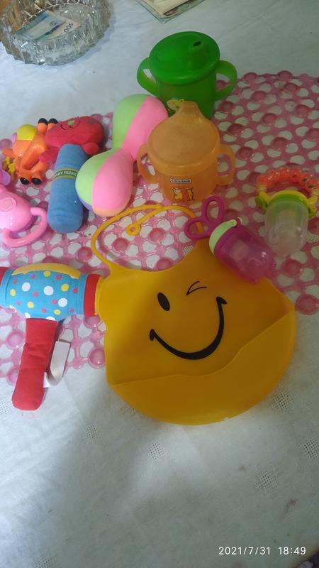 набор для малыша бу, состояние хорошее входит 2 чашки, силиконовый слюнявчик, 2 ниблера один новый из них фиолетовый), коврик в ванную против скольжения силиконовый, и погремушки, молоток мягкий безопасный шуршит и т. д. ещё бодики, кофточки новорожденных, за весь набор 350 грн.