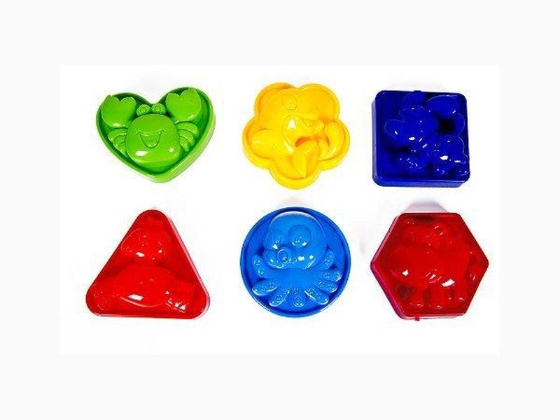 Яскравий пісочний набір. Складається з 6-ти платікових пасочек різних форм і кольорів. Розмір пасочки: ~ 10 см. Габарити в упаковці: 10 x 13 x 10 см