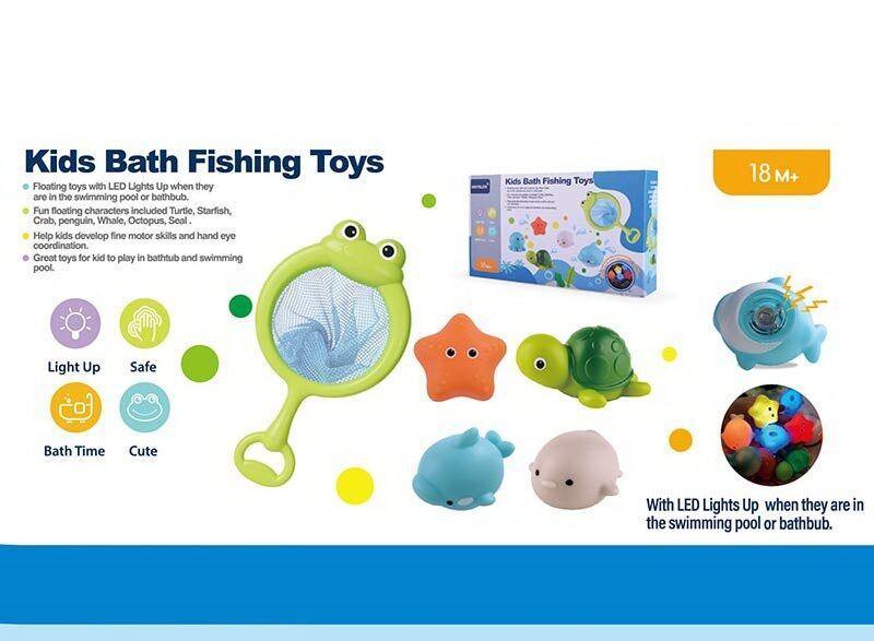 Цікава гра для ванни, яка захопить малюка з перших хвилин! Виконана у вигляді риболовлі, де замість вудки - великий сачок, яким потрібно спіймати маленьких морських мешканців. Головною відмінністю ігрових елементів є яскраве підсвічування, яке активується, як тільки іграшки потрапляють у воду. Кольорові вогники допоможуть дитині зорієнтуватись у “морській поверхні” та підхопити кожного мешканця. Особливості: - набір включає 9 елементів; - великий сачок у вигляді жабеня; - 8 морських мешканців з кольоровим підсвічуванням; - сенсорні ігрові елементи, які реагують на воду (у сухому стані не підсвічуються); - сачок виконаний з міцного пластику; - морські мешканці виконані з якісної щільної гуми; - підсвічування елементів працює від батарейок, які входять до комплекту