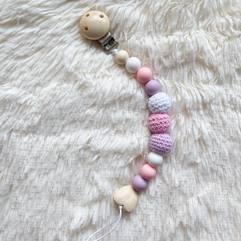 Довжина кріплення та намистин 23 см, довжина повністю 35 см. Якісний та безпечний металевий тримач, складається з дерев‘яних, в’язаних та силіконових намистин, які можна гризти.