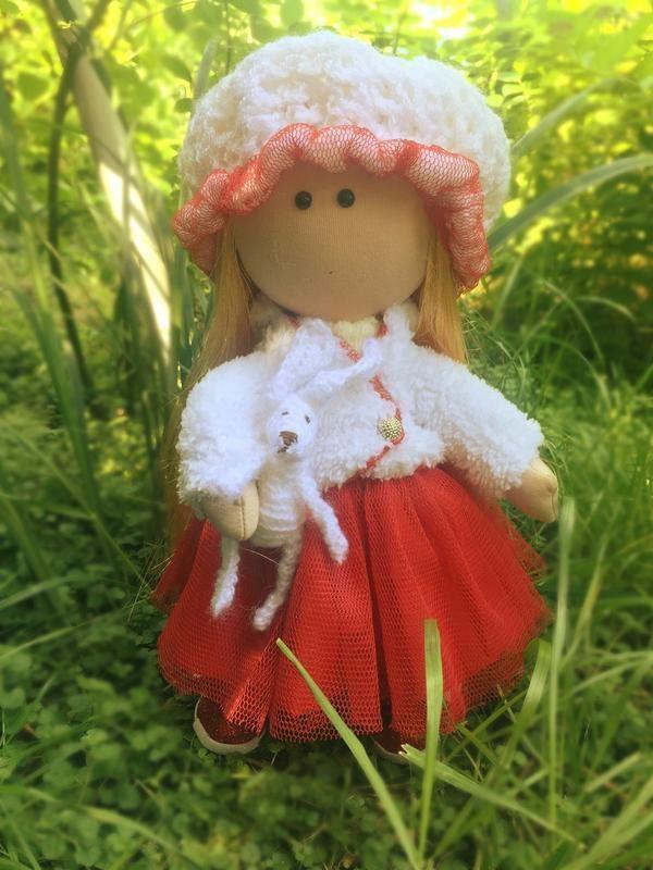 Зростання - 28см Лялечка в білій шапочці, пухнастою шубці і червоних черевичках з плетеним зайчиком