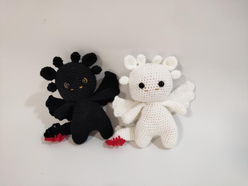 В'язаний дракончик беззубик. Символ року. Чурна та біла фурія. Зріст іграшки 17 см, очі на безпечному кріпленні, наповнювач холофайбер.