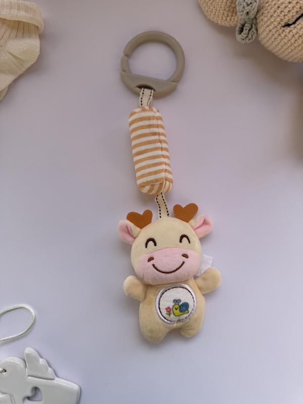Мʼяка підвіска-іграшка у вигляді корівки. Опис: • Виконана з приємної на дотик плюшевої тканини. • Має усміхнене личко, рожеві ріжки та вишиту аплікацію на животику (равлик). • Оснащена пластиковим кільцем для кріплення до коляски, ліжечка чи автокрісла. • Є м’яка смугаста деталь, що додає текстурного різноманіття. • Має вбудований дзвіночок та шурхотливий наповнювач, що стимулює сенсорний розвиток малюка. Ця іграшка ідеально підходить для немовлят, адже розвиває зорову, слухову та тактильну чутливість.