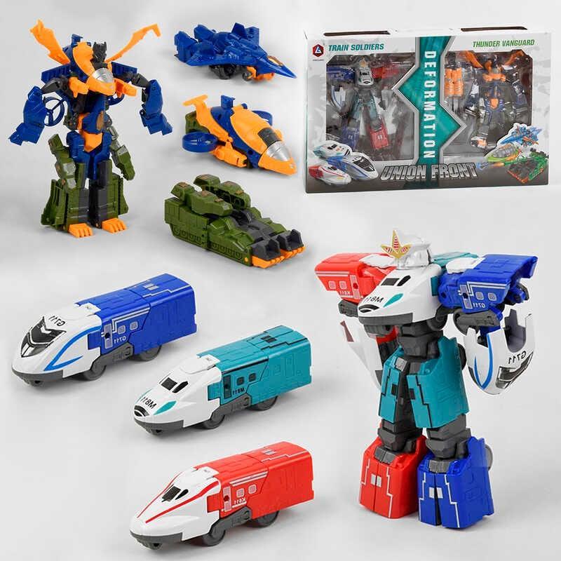 Колекційний набір трансформерів HD 48 Пориньте у всесвіт неймовірних пригод із нашим набором трансформерів HD 48! Ця унікальна колекційна серія включає два потужні та бойові роботи: Train Soldiers та Thunder Vanguard, які готові до захисту та боротьби за справедливість на Землі. Train Soldiers - Герой, який завжди прийде на допомогу. - Відзначається сміливістю та силою. - Яскраві кольори: червоний, білий, синій та бірюзовий. - Виготовлений з ударостійкого пластику, що гарантує довговічність. - Може трансформуватися у три моделі супершвидкісних локомотивів. Thunder Vanguard - Складається з трьох моделей військової техніки: винищувач, літак і бронетранспортер. - Витривалий у найнебезпечніших битвах. - Корпус забарвлений у зелений, помаранчевий і сірий кольори з контрастними помаранчевими вставками. Інструкція містить кроки по трансформації роботів, щоб забезпечити максимальну зручність у грі.