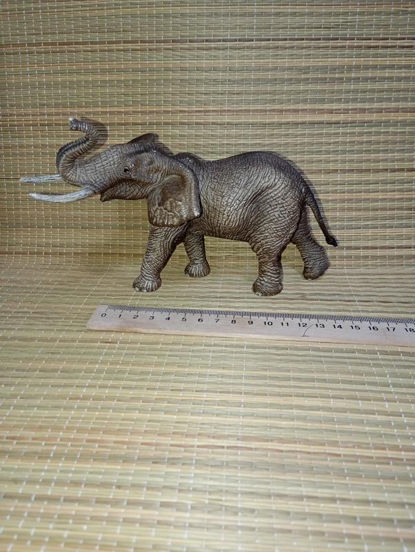 Велика реалістична фігурка африканського слона від німецької компанії Schleich. Фігурки Schleich відомі своєю високою деталізацією та реалістичним виглядом. Ця модель, ймовірно, є фігуркою самця африканського слона (Schleich 14762), випущеною у 2016 році, оскільки його хобот піднятий, а рот відкритий, ніби він видає трубний звук. Фігурки Schleich виготовляються з безпечного пластику, а їх розпис виконується вручну.