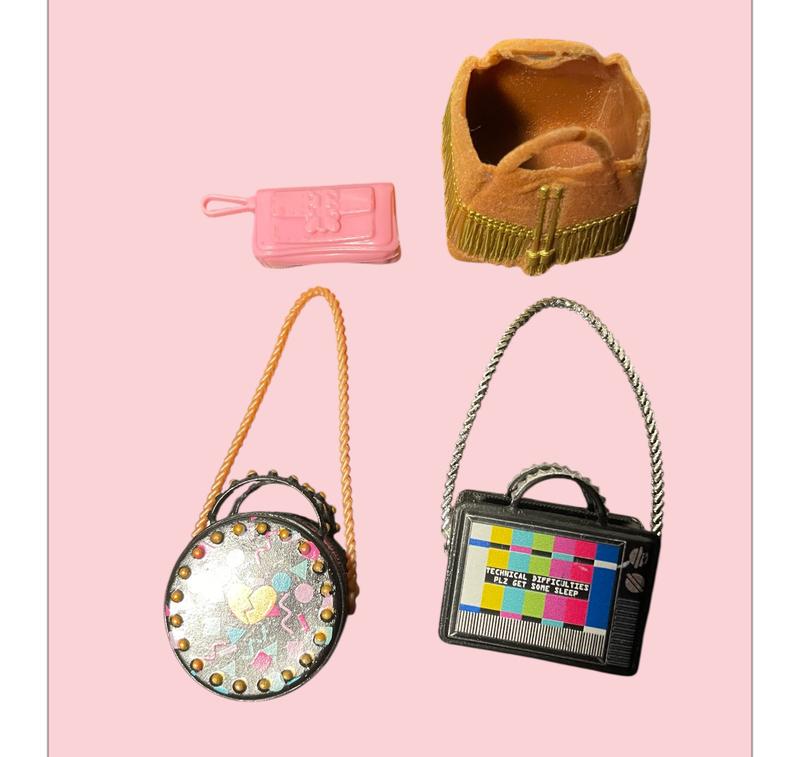Колекційні Аксесуари для ляльок Monchhichi - роликові ковзани из McDonald's аксесуари для ляльки L.O.L ТВ-сумка LOL OMG ексклюзивна сумочка, яка входить до комплекту пересувного гардероба L.O.L. Surprise Сумочка з бахромою Рождественська Барбі 2008, рожева сумочка-клатч