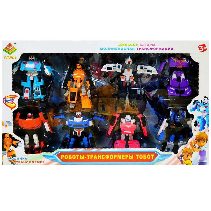 Набір роботів трансформерів «Тоботи» в кількості з восьми штук здивує й потішить кожного шанувальника цього мультфільму. Мінітоботи дуже схожі на своїх персонажів із популярного мультсеріалу. Кожен робот трансформується в машинку, вертоліт або в будівельну техніку та назад. Іграшка легко трансформується всього в декількох рухах. З таким набором дитина зможе поповнити свій автопарк новою технікою і в будь- який момент перетворити їх на воїнів, які борються за спокій і світ жителів вигаданого міста. У наборі 8 трансформерів — 5 легкових автомобілів, джип, вертоліт, екскаватор. Довжина машинок досягає 10 см. Висота робота тобота 12 см. Розмір коробки 50 * 8 * 30 см.