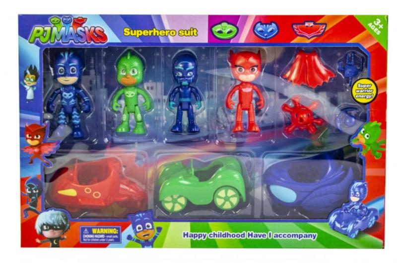 Герої в масках — у наборі 3 головні герої популярного мультфільму. У іграшок рухомі руки та ноги. Висота іграшки 9 см. Діти ведуть порівняно нормальне життя вдень, де вони сусіди, школярі та друзі. У нічний час, однак, вони активують свої браслети, які зв'язують у піжамах, перетворюючи їх на супергероїв Також на лінійки іграшок PJ Маски іграшок будуть фігурки, ігрові набори, транспортні засоби та м'які іграшки на додаток до одягу вгору та рольової гри. З Іграшками серіалу PJ Маски дитина зможе відтворити улюблені моменти, розвивати уяву та пам'ять.