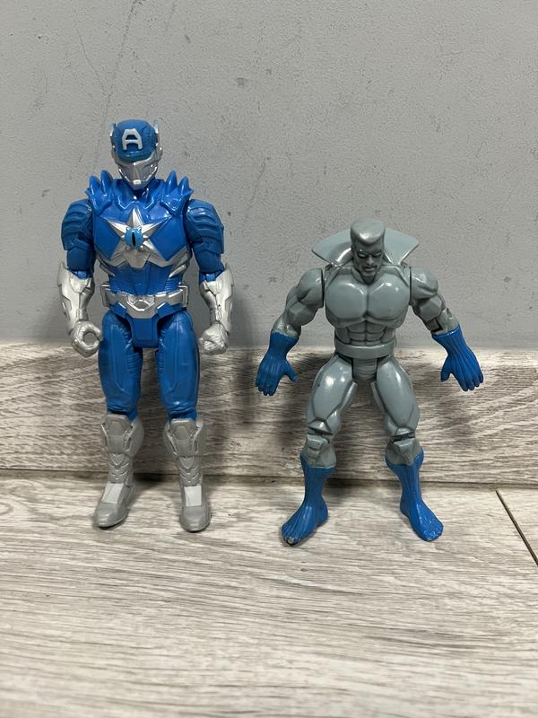 Фігурка, зображена на знімку, — це Marvel Avengers Mech Strike Monster Hunters Captain America. Фігурка, зображена на знімку, — це артикульована фігурка Залізної людини Сірої Горгульї (Iron Man Grey Gargoyle) від ToyBiz 1994 року. Розмір: 15см. 13см.